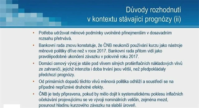 Rada dále uvedla, že vidí jako pravděpodobné ukončení režimu devizových intervencí v polovině roku 2017. Termín možného ukončení intervencí ČNB odůvodnila vývojem inflace, která se nadále nachází pod dvouprocentním cílem.