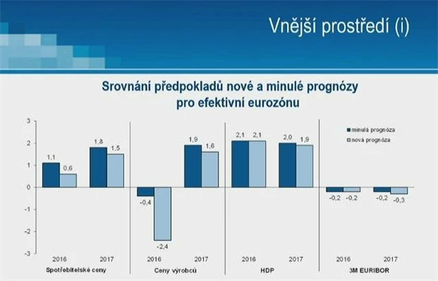 Guvernér ČNB Miroslav Singer na tiskové konferenci po zasedání bankovní rady rovněž představil aktuální makroekonomickou prognózu. V ní ČNB zhoršila odhad vývoje české ekonomiky v letošním roce na 2,3 %. Naopak zlepšila výhled růstu hrubého domácího produktu pro příští rok na 3,4 %. V předchozí únorové prognóze ČNB počítala letos s růstem o 2,7 % a v roce 2017 o 3 %.