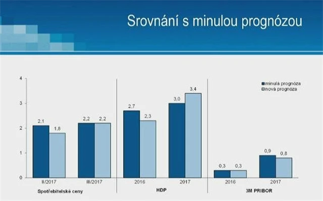 ČNB rovněž upravila odhad vývoje inflace. V druhém čtvrtletí 2017 počítá centrální banka s inflací 1,8 % a ve třetím čtvrtletí 2017 s inflací 2,2 %. V minulé prognóze odhadovala, že inflace bude ve druhém čtvrtletí 2,1 %. Odhad pro třetí čtvrtletí zůstal nezměněný.