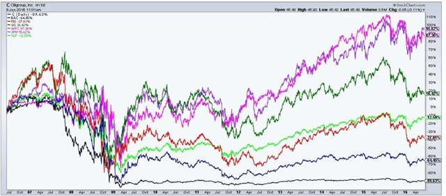 Jak upozorňuje Nick Colas, šéf stratégů ve společnosti Convergex, finanční sektor v USA (měřeno hodnotově váženým indexem akcií finančního sektoru v rámci indexu S&P 500) je právě takovým případem. A navíc jde o jediný sektor, který v poslední dekádě zaznamenal negativní výkonnost. Finanční sektor, v němž jsou zahrnuty banky, brokerské společnosti, pojišťovny, vydavatelé platebních karet a další, tak za deset let ztratil více než 33 %.