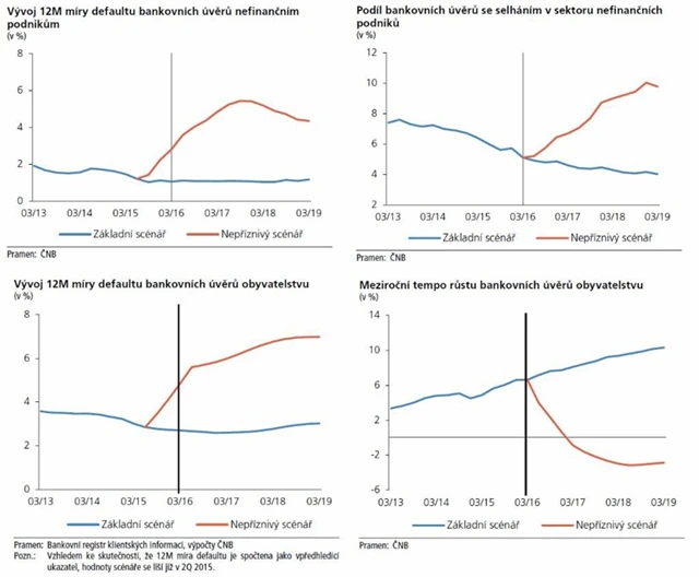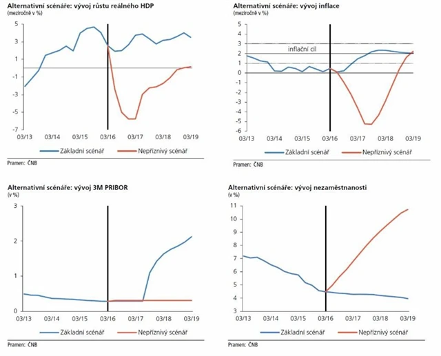 Odolnost bankovního sektoru byla hodnocena prostřednictvím testů za použití alternativních scénářů ekonomického vývoje. Základní scénář vycházel z květnové prognózy banky a představoval vývoj, který ČNB považuje za nejpravděpodobnější. Nepříznivý scénář, jehož pravděpodobnost je naopak velmi nízká, předpokládal silnou recesi a propad ekonomiky do deflace.