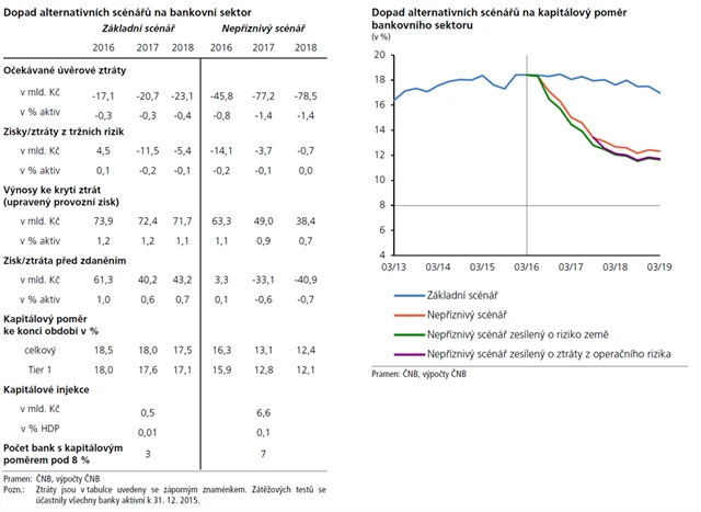 Podle testů z listopadu 2015 by se ve stresovém scénáři dostalo pod 8% limit devět bank, které by si potřebovaly kapitál navýšit o deset miliard korun.