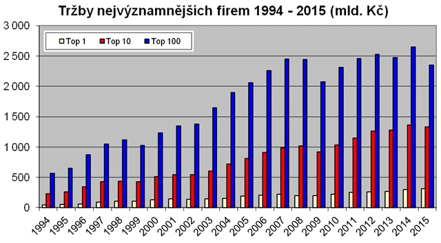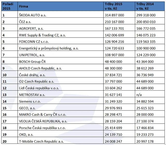 Škoda Auto loni vykázala tržby 315 miliard korun, druhý ČEZ měl tržby 210 miliard korun a třetí Agrofert 167 miliard korun. Čtvrtou příčku obhájila firma RWE Supply & Trading CZ. Na páté místo postoupil z loňské šesté pozice Foxconn CZ.