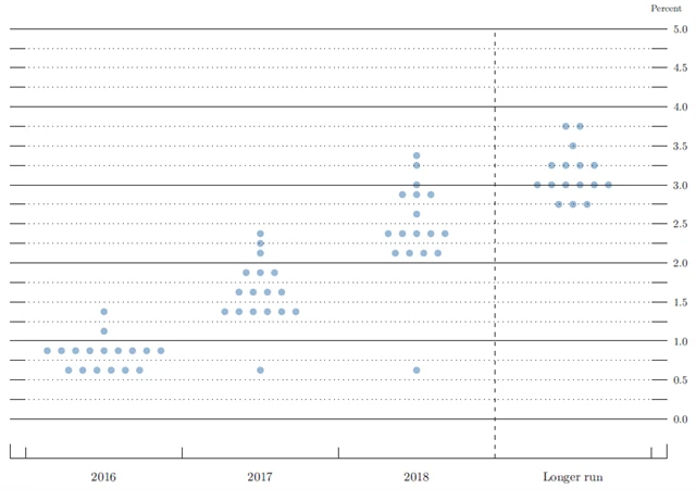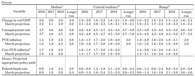 Cíl základní úrokové sazby pro letošní rok Fed ponechal na 0,9 %, pro rok 2017 banka cíl snížila na 1,6 % (březen: 1,9 %) a pro rok 2018 cíl posunula na 2,4 % (březen: 3 %). Prognóza tak naznačuje, že základní úroková sazba by se ve druhé polovině letošního roku měla zvýšit dvakrát. Oproti březnovému zasedání měnového výboru se ale výrazně zvýšil počet činitelů Fedu, kteří počítají pouze s jedním zvýšením sazby. Trh čeká jedno až dvě zvýšení.