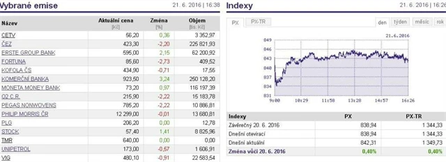 Index pražské burzy PX si během úterního obchodování připsal 0,4 % a skončil na 842,31 bodu. Nejúspěšnějšími tituly byly Komerční banka a Erste Group Bank, naopak nejvíce ztrácela sázková kancelář Fortuna.