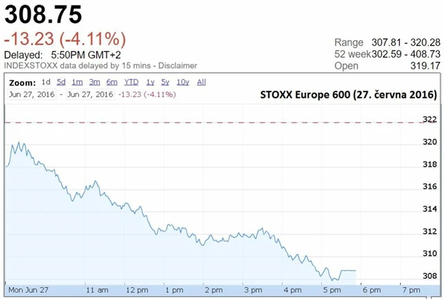 Západoevropské akciové indexy se v pondělí znovu propadly hluboko do červených čísel. Za poklesem benchmarků je nejistota kolem odchodu Spojeného království z Evropské unie, který ve čtvrtek odhlasovali Britové v referendu. V pátek se západoevropský index STOXX Europe 600 propadl téměř o sedm procent. Akcie firem ze zbylých zemí EU v pondělí znovu ztrácely podstatně více než akcie předních britských společností. Vysoké ztráty zaznamenávaly hlavně akcie bank, cestovních kanceláří a aerolinek.