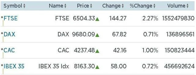 Podobně si vedly i indexy jednotlivých velkých akciových trhů západní Evropy. Britský index FTSE 100 skončil na svém letošním maximu, když připsal 2,27 % na 6 504,33 bodu. Německý DAX připsal 0,71 % na 9 680,09 bodu a francouzský CAC 40 posílil o rovné procento na 4 237,48 bodu. Panevropský index FTSEurofirst 300 přidal 0,96 % a uzavřel na 1 303,27 bodu.