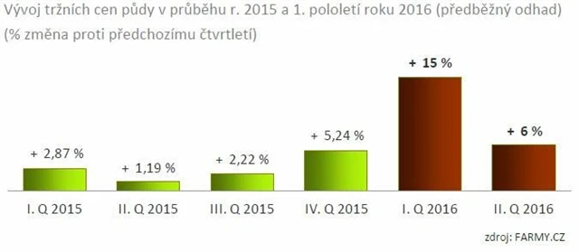 Podle odhadovaného vývoje tržních cen zemědělské půdy za první a druhé čtvrtletí 2016 roste cena zemědělské půdy v ČR rekordním tempem. Data jsou kalkulací z dosud zpracovaných údajů o realizovaných obchodech, konečné statistiky budou známy až v lednu 2017.