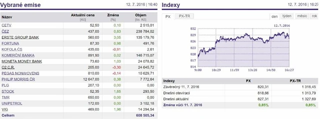 Pražská burza v úterý navázala na pondělní růst a index PX stoupl o 0,85 % na 827,31 bodu.