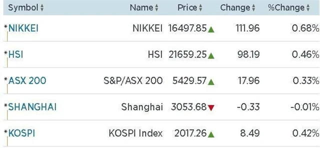 Australský index S&P/ASX 200 připsal 0,33 %, když jej podpořily tradičně silné sektory finančnictví, těžby a surovin. Za týden získal 3,81 %. Korejský Kopsi posílil o 2,76 % a hongkongský index Hang Seng uzavřel se ziskem 0,23 %.