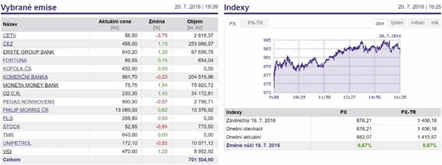Pražská burza ve středu navázala na zisky z předcházejících dvou dnů a index PX přidal 0,67 % na 882,07 bodu. Úspěšnou seanci zažila většina finančních titulů a operátor O2 Czech Republic. V červených číslech skončily akcie Komerční banky a Unipetrolu.