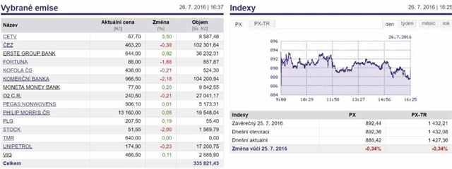 Objem obchodování byl stejně jako v pondělí výrazně utlumený, až před koncem seance se přehoupl přes 300 milionů Kč. Akcie CME, která v Česku vlastní televizi Nova a další stanice, v úterý po zveřejnění meziročního nárůstu čistých tržeb ve druhém kvartálu zpevnily o 3,5 % na 57,70 Kč. Erste Group Bank si připsala 0,92 % na 644 Kč.