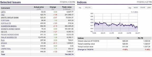 Index PX ve čtvrtek po dvou svátečních dnech ztratil 1,42 % na 814,58 bodu.