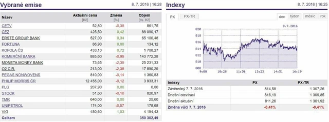 V negativních číslech skončily i MONETA Money Bank, která přišla o 2,39 %, a O2 Czech Republic s 2,38% poklesem.