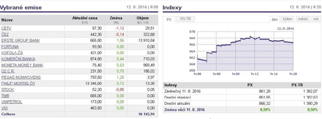 Index pražské burzy PX v prvních minutách obchodování získal 0,59 procenta, když vzestup vedly především Erste Bank Group a textilka Pegas Nonwovens. Naopak ztrácely akcie mediální firmy CME a likérky Stock Spirits.