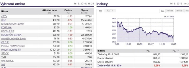 Index pražské burzy PX během úterního obchodování odepsal 0,58 % a uzavřel na 856,30 bodu.
