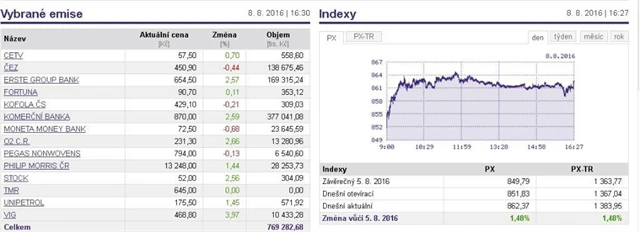 Pražská burza v pondělí připsala zisk téměř půldruhého procenta