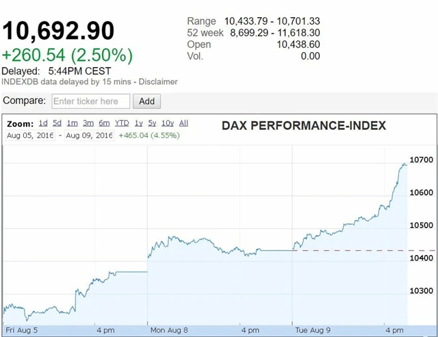 Německý index DAX se dostal na letošní maximum 10 691,21 bodu a uzavřel se ziskem 2,5 %. O jeho vzestup se zasloužily především akcie zajišťovny Munich Re, která vykázala nižší pokles zisku, než předpovídali analytici. Francouzský CAC 40 si připsal 1,19 %.