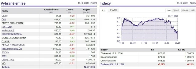 Největší zobchodovaný objem připadl na akcie skupiny ČEZ, které naopak 0,5 % připsaly, a v plusu se udržely i cenné papíry MONETA Money Bank, které zaznamenaly největší procentuální zisk dne a posílily o 1,67 %. Naproti tomu největší procentuální ztráta postihla akcie pojišťovny VIG, které odepsaly 2 %, a přes procento ztrácely také cenné papíry tabákové společnosti Philip Morris ČR a Unipetrolu.