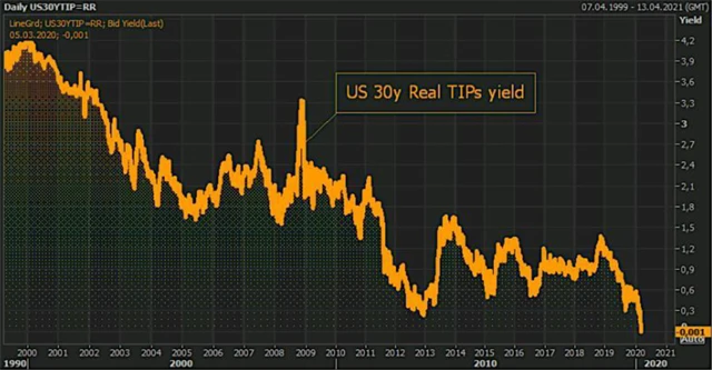 Výnos třicetiletých TIPS (treasury inflation protected securities), neboli státních dluhopisů indexovaných na inflaci, poprvé v historii klesl do záporných hodnot.