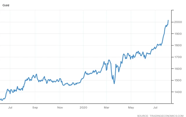 4. srpna 2020: Den, kdy se spotová cena zlata poprvé usadila nad 2 000 USD za trojskou unci