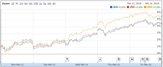 Za celý týden Dow vzrostl o 4,25 %, S&P 500 přidal 4,3 % a Nasdaq Composite zpevnil o 5,31 %. V předchozím týdnu naopak indexy o zhruba pět procent klesly, a zažily tak nejprudší týdenní propad za dva roky. Důvodem byly obavy investorů z možného rychlejšího růstu inflace a razantnějšího utahování měnové politiky Fedu.