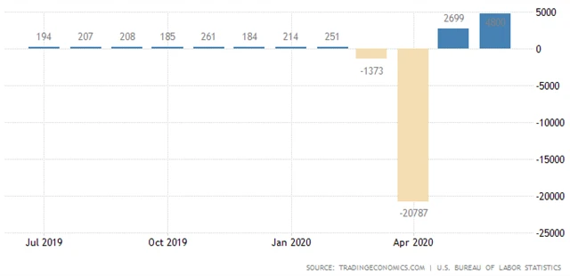 I přes masivní nárůst počtu pracovních míst v uplynulých dvou měsících se ale trh práce ani zdaleka nezotavil ze ztráty 22 milionů míst v březnu a dubnu v důsledku opatření proti šíření nemoci COVID-19. Ožívání americké ekonomiky, která je šestým měsícem v recesi, by navíc mohlo zabránit nové šíření koronaviru (Texas opětovně zavedl povinnost nosit roušku) a opětovné uzavírání podniků v některých amerických státech.