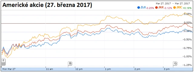 Americké akcie zahájily týden dalším poklesem. Index Dow se snížil poosmé za sebou, a zaznamenal tak nejdelší sérii ztrát za téměř šest let. Investoři se nyní snaží odhadnout, jaký dopad bude mít páteční neúspěch při prosazování zdravotnické reformy na další politické plány amerického prezidenta Donalda Trumpa, zejména pak na daňovou reformu.