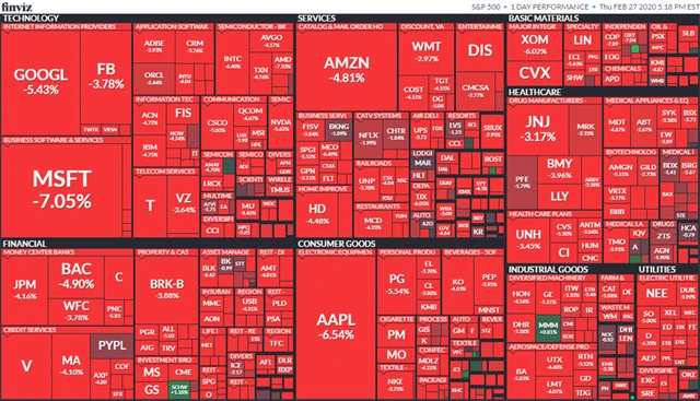 Akcie ve Spojených státech ve čtvrtek už šestou seanci za sebou klesly. Může za to šíření koronaviru, které zvyšuje obavy o budoucí ekonomický růst a vývoj zisků společností. Širší index S&P 500 zaznamenal dokonce nejvýraznější propad od roku 2011 a nejrychlejší korekci v historii, když z maxima klesl o více než 10 % za pouhých šest dní.
