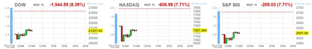 Širší index S&P 500 a index Nasdaq Composite, v němž je zahrnuta řada firem z odvětví vyspělých technologií, po 15.00 SEČ vykazovaly pokles o více než devět procent. Americké akcie tak navázaly na pondělní propad na asijských a evropských burzách.