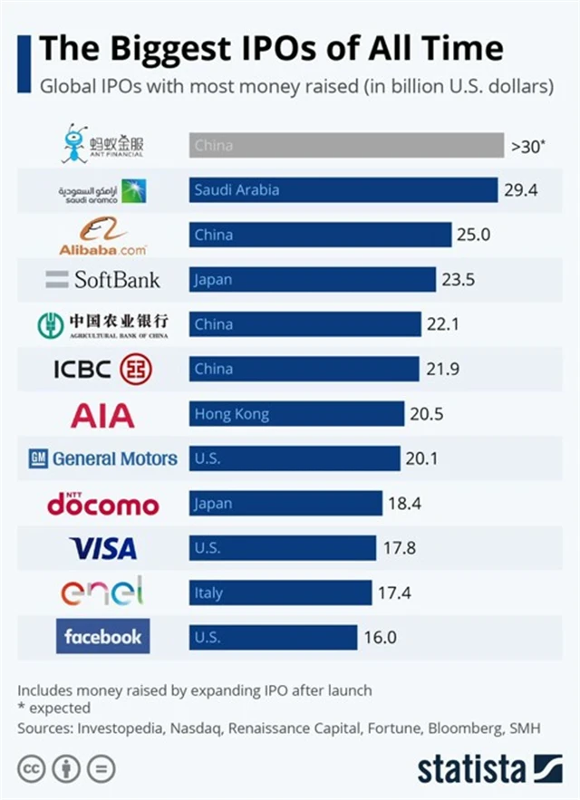 Společnost Ant Group by tak mohla překonat rekord saúdskoarabské ropné firmy Saudi Aramco, která v rámci loňské primární veřejné nabídky akcií získala 29,4 miliardy dolarů. Předchozí rekord držela primární emise akcií společnosti Alibaba, která v roce 2014 vynesla 25 miliard dolarů.