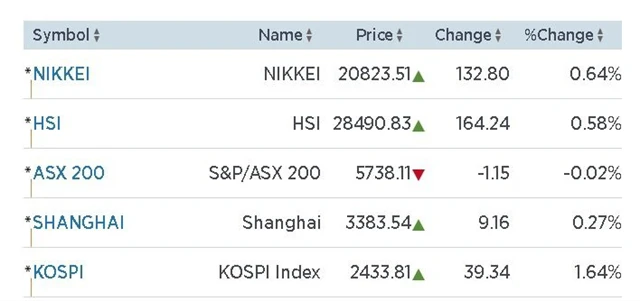 Index australské burzy ASX 200 naopak uzavřel na červené nule, když tamní burzu táhl dolů subindex energetického sektoru. Hongkongský index Hang Seng začal nevalně, ale během dne ztráty dohnal a nakonec skončil na 0,5 prpcenta. Stoupaly i trhy pevninské Číny v Šenčenu a Šanghaji.