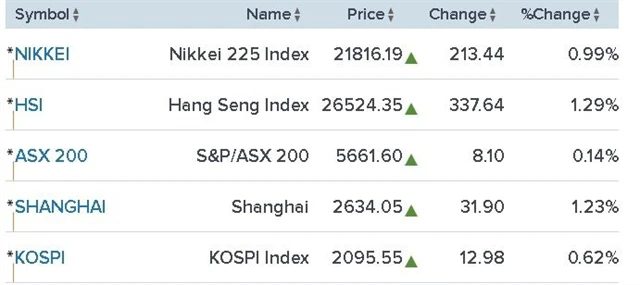 O téměř celé procento posílil i hlavní index tokijské burzy NIkkei 225; širší index Topix si připal skromnější zisky, stejně jako australská burza. Jihokorejský index Kospi přidal více než půl procenta.