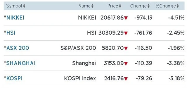 Hlavní index tokijské burzy Nikkei 225 poklesl o 4,51 procenta, když se během dne dostal až na pětiměsíční minimum. Ceny akcií tlačil dolů také sílící jen, jehož hodnota naopak dosáhla šestnáctiměsíčního maxima. Hlavní vývozci zaznamenali pokles: Honda Motor přišla o 5,27 procenta, zatímco Sony odepsala 2,73 procenta.