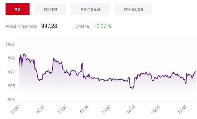 Index pražské burzy PX si během čtvrtečního obchodování připsal zisk 0,07 % a uzavřel seanci na hodnotě 997,28 bodu. Zásluhu na tom měly především zisky akcií Monety Money Bank a Erste Group Bank, jež převážily nad ztrátami Komerční banky, nejobchodovanějšího titulu dne.