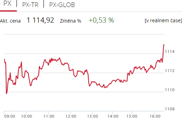 Pražská burza v úterý počtvrté v řadě stoupla, když index PX zpevnil o 0,53 % na 1 114,92 bodu. Jedná se o nejvyšší hodnotu od srpna 2011. Nahoru burzu táhly zejména energetická skupina ČEZ, Komerční banka a Moneta Money Bank, nedařilo se naopak pojišťovně VIG a sázkařské společnosti Fortuna. Objem obchodů byl s 431 miliony korun podprůměrný.