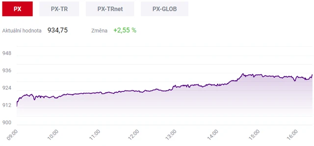 Pražská burza pošesté po sobě vzrostla a index PX zakončil pondělní obchodování nejvýše za téměř čtyři měsíce. Přidal 2,55 % na 934,75 bodu. Silně rostly akcie bank a telekomunikační firmy O2.