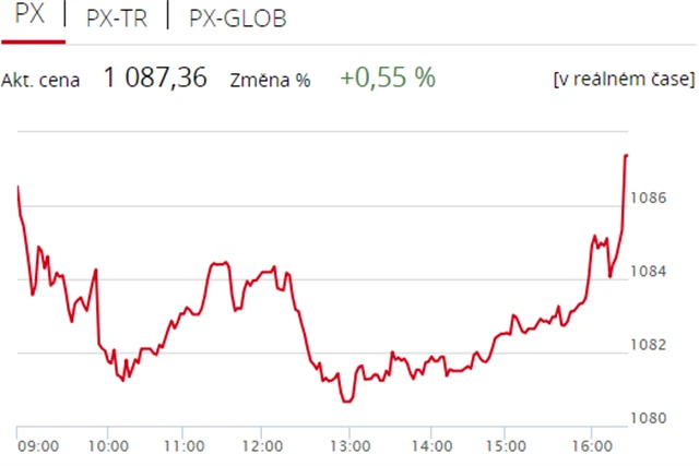 Pražská burza se ve středu odrazila od ztráty z úterního obchodování, když index PX stoupl o 0,55 % na 1 087,36 bodu. Nahoru burzu táhly zejména akcie energetické skupiny ČEZ a Komerční banky, proti trendu šla společnost Avast. Zobchodovaný objem byl s 421 miliony korun podprůměrný.