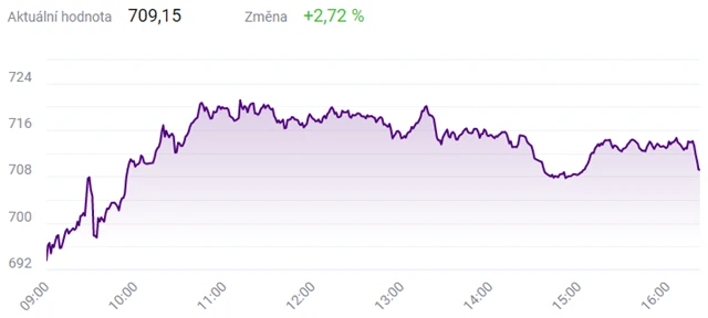 Před 14.00 index PX rostl o 3,73 % na 716,13 bodu. Mírně pod nulou byly akcie Komerční banky (-0,21 %), ostatní emise byly v plusu. Výrazně se zvyšovala cena akcií Avastu (+8,59 %). Více než 4 % přidávaly i akcie Monety Money Bank (+4,72 %), VIG (+4,92 %) a Erste Group Bank (+4,08 %).