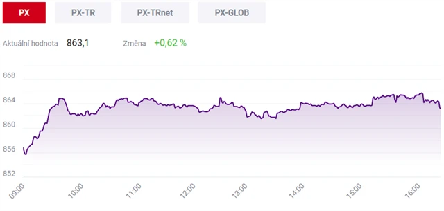 Pražská burza se na konci týdne obrátila k růstu, index PX přidal 0,62 % na 863,10 bodu. Posilovaly akcie bank, klesly cenné papíry energetické firmy ČEZ. Více než tři procenta ztratily cenné papíry výrobce netkaných textilií PFNonwovens.