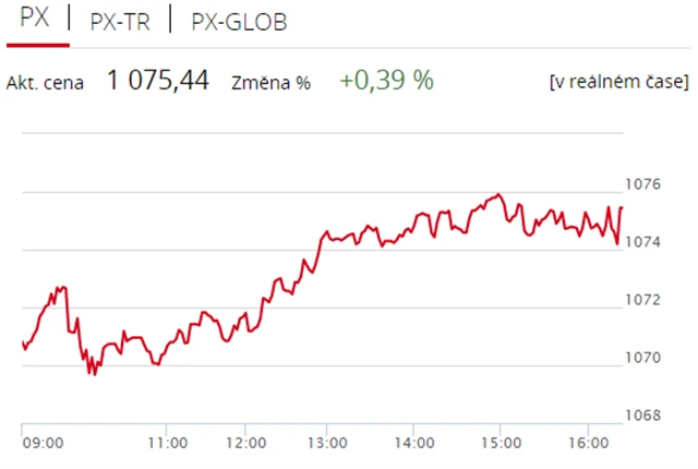 Pražská burza ve středu uzavřela v pozitivním pásmu, index PX získal 0,39 % na 1 075,44 bodu. Rostla tak již podeváté v řadě. Nahoru burzu táhly zejména akcie Komerční banky, které při nejvyšším zobchodovaném objemu z hlavních titulů zdražily o 1,01 % na 904 Kč. Objem obchodů byl s necelými 326 miliony korun nadprůměrný.