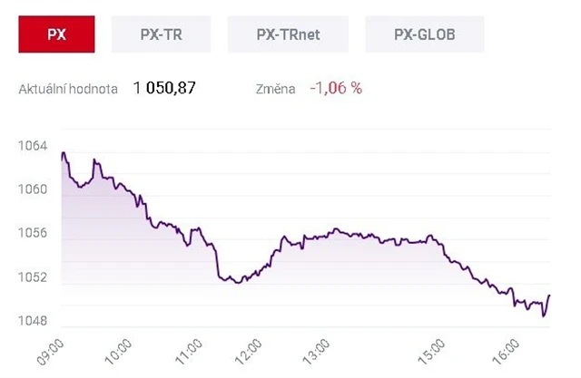 Index pražské burzy PX během čtvrtečního obchodování klesl o 1,06 % a zakončil seanci na 1 050,87 bodu. Nejvíce ztratily akcie Komerční banky a Erste Group Bank. Jejich ztráty převážily nad zisky Monety Money Bank a elektrárenské firmy ČEZ. Zobchodovaný objem čítal těsně přes 330 milionů korun.