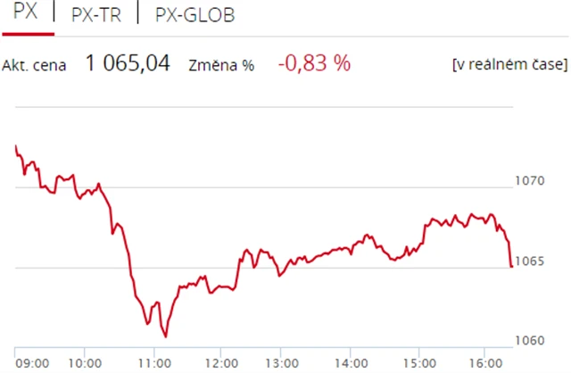 Pražská burza v polovině pracovního týdne klesla, index PX přišel o 0,83 % na 1 065,04 bodu. Dolů burzu stáhly zejména akcie energetické skupiny ČEZ a Komerční banky, dařilo se naopak Erste Group Bank. Zobchodovaný objem byl s 569 miliony korun mírně nadprůměrný.