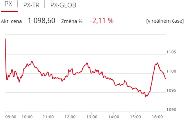 Pražská burza v úterý prohloubila ztrátu z pondělního obchodování, když index PX spadl o 2,11 % na 1 098,6 bodu. Dolů burzu stáhly zejména finanční tituly a energetická skupina ČEZ, v negativním pásmu však uzavřely všechny hlavní tituly s výjimkou textilky Pegas Nonwovens. Objem obchodů byl s více než 1 miliardou korun výrazně nadprůměrný.