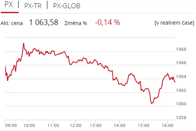 Pražská burza ve čtvrtek prohloubila ztrátu ze středečního obchodování, když index PX odepsal 0,14 % na 1 063,58 bodu. Dolů burzu stáhly zejména akcie Komerční banky, dařilo se naopak polostátní společnosti ČEZ. Zobchodovaný objem byl s 583 miliony korun mírně nadprůměrný.