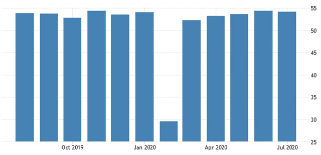 I přes nárůst počtu nových případů onemocnění covid-19 v některých čínských regionech má země podle odhadů analytiků naději zotavit se z koronavirové krize ještě do konce roku 2020. Index nákupních manažerů ve zpracovatelském sektoru v červenci klesl na 54,2 bodu z červnových 54,4 bodu. I tak překonal odhad analytiků, kteří předpovídali 54,1 bodu.