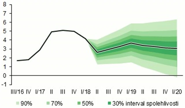V nové makroekonomické prognóze ČNB zhoršila odhad růstu tuzemské ekonomiky v letošním roce. Hrubý domácí produkt podle ní letos vzroste o 3,2 %, v květnové prognóze banka expanzi odhadovala na 3,9 %. Pro příští rok ČNB odhad ponechala na 3,4 %, pro rok 2020 očekává růst ekonomiky o 3,3 %.