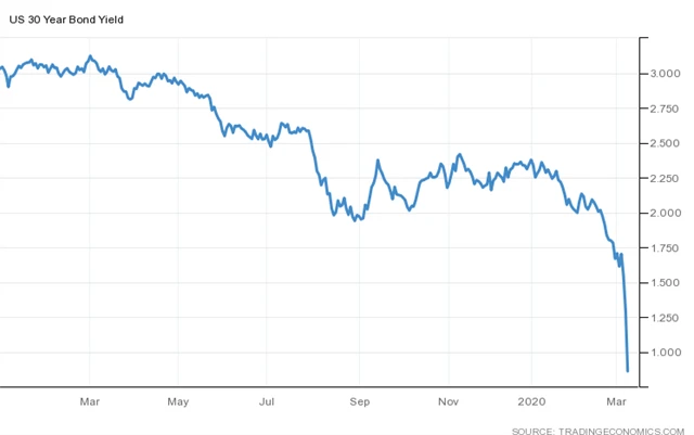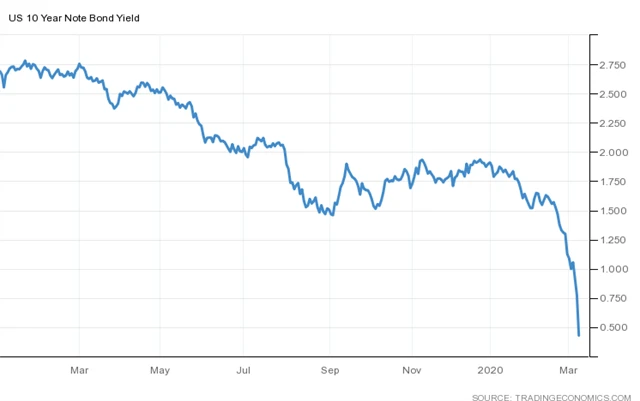 Výnos desetiletého dluhopisu USA v průběhu noci na pondělí poprvé v historii klesl pod 0,4 %, na chvíli se obchodoval na 0,3469 %. V průběhu pondělního dopoledne se výnos pohybuje těsně nad 0,4 %, jen v březnu už klesl o 40 bazických bodů. Za poklesem stojí strach z šíření konaviru po celém světě, cenová válka na trhu s ropou, a také sázky na to, že Fed kvůli nervozitě na trzích ještě v březnu opět sníží sazby.