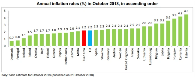 Nejnižší inflace byla v září v Dánsku a v Portugalsku, kde se pohybovala těsně pod jedním procentem, naopak nejvyšší zaznamenaly Estonsko a Rumunsko, kde přesáhla čtyři procenta. V porovnání se zářím roční míra inflace klesla v osmi zemích, v pěti zůstala beze změny a ve 14 vzrostla.