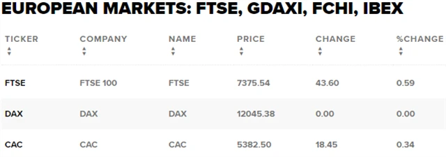 Regionální index STOXX Europe 600 posílil o 0,21 % na 378,27 bodu, britský FTSE 100 si připsal 0,59 % na 7 375,54 bodu a francouzský CAC 40 se zvýšil o 0,34 % na 5 382,5 bodu. V Německu se v pondělí kvůli státnímu svátku neobchodovalo.